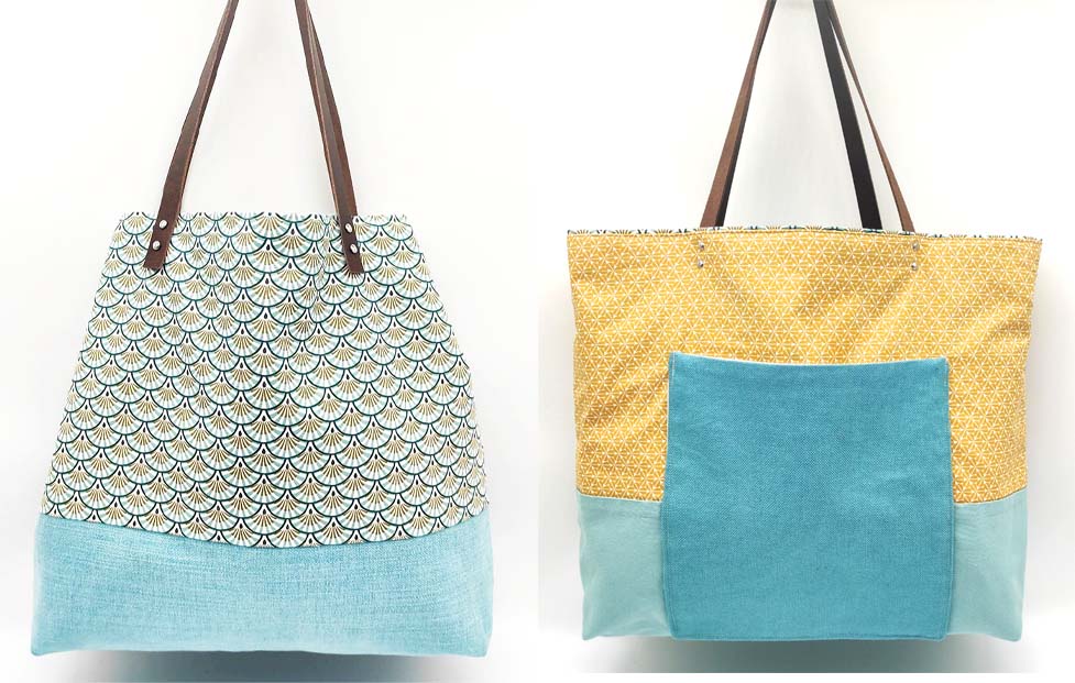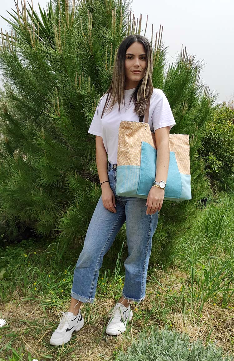 διπλής όψης, από ανθεκτικό βαμβακερό ύφασμα, εσωτερικά επενδυμένο με καραβόπανο, μεγάλη τσέπη και δερμάτινα χερούλια.