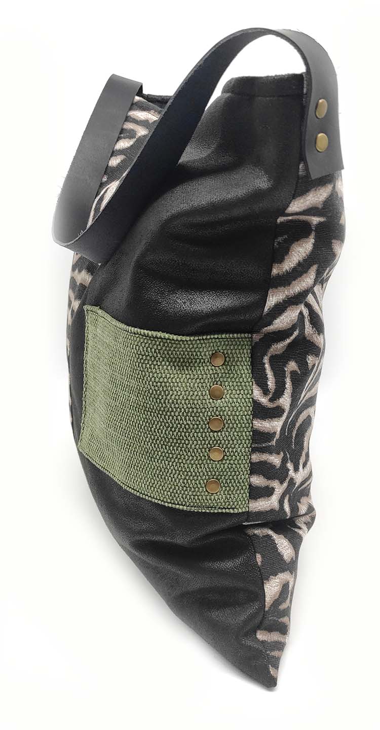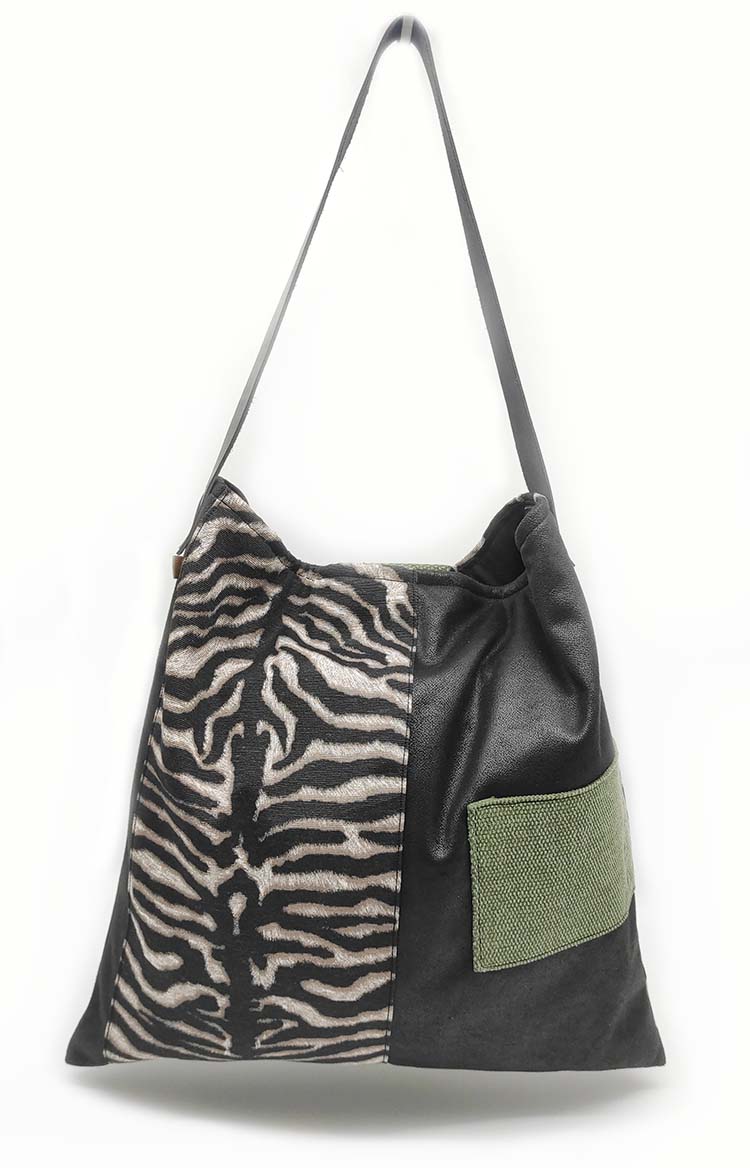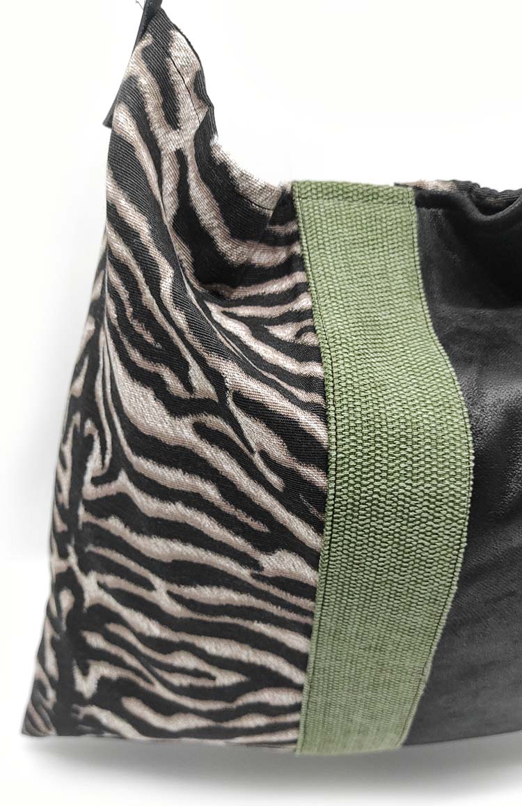 animal print δυο όψεων από μαύρο ύφασμα τύπου δέρμα, χακί καραβόπανο και εσωτερική τσέπη.